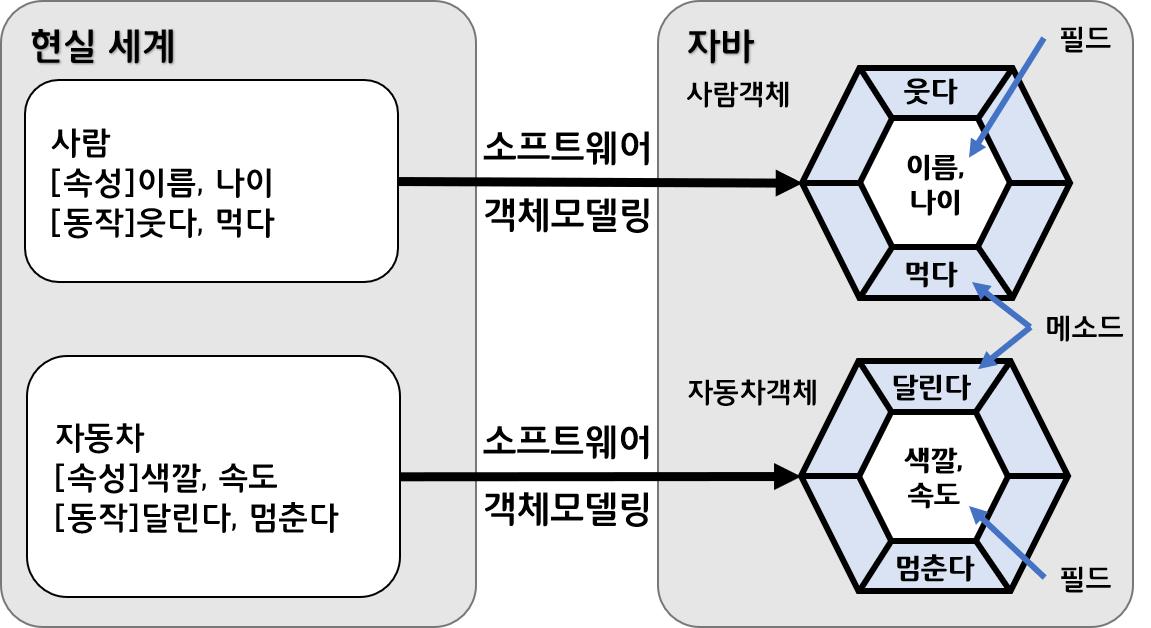 객체지향 측면 : 현실세계에 있는 객체를 객체지향프로그램에서 사용하기 위해 객체는 상태정보(멤버변수)와 행위정보(멤버메서드)를 가지고 있습니다.