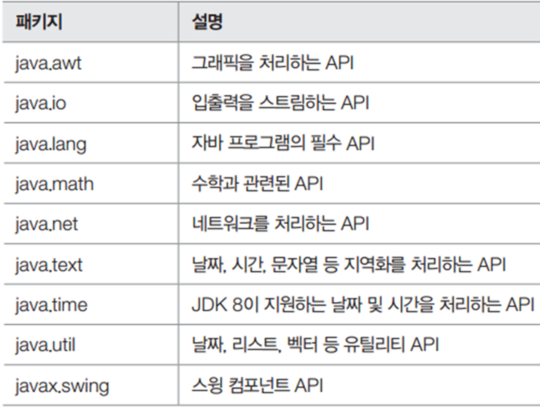 java는 대부분 2단계의 폴더구조를 가지고 있다 (API) / 기능이 비슷한 API들끼리 묶어서 패키지로 보관하여 사용하고 있다.