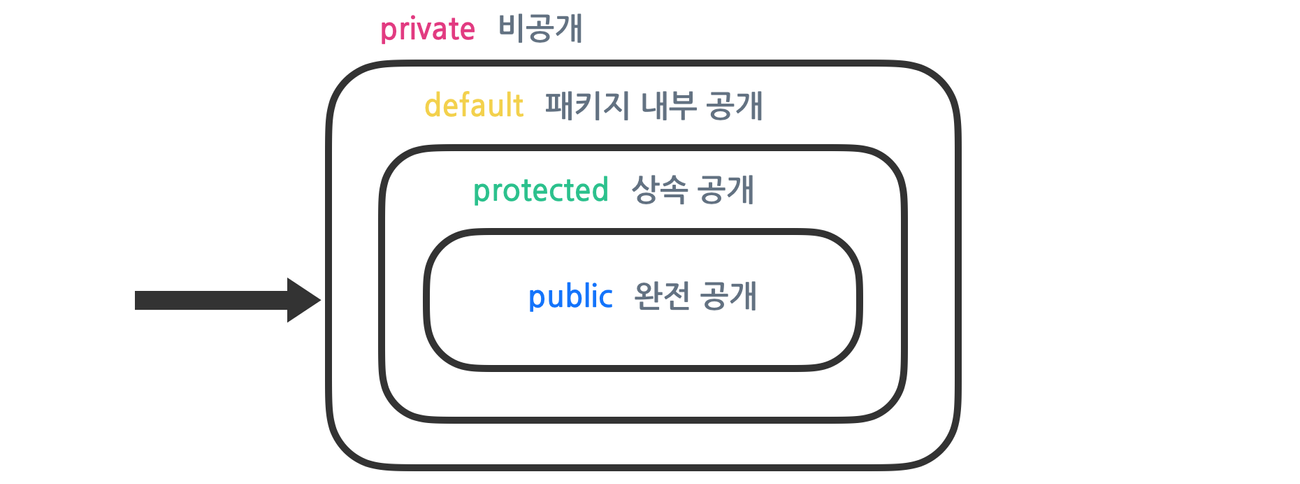 - default : 동일한 패키지에서만 접근 가능 (코드에 작성되어 있지 않고 생략되어 있음)