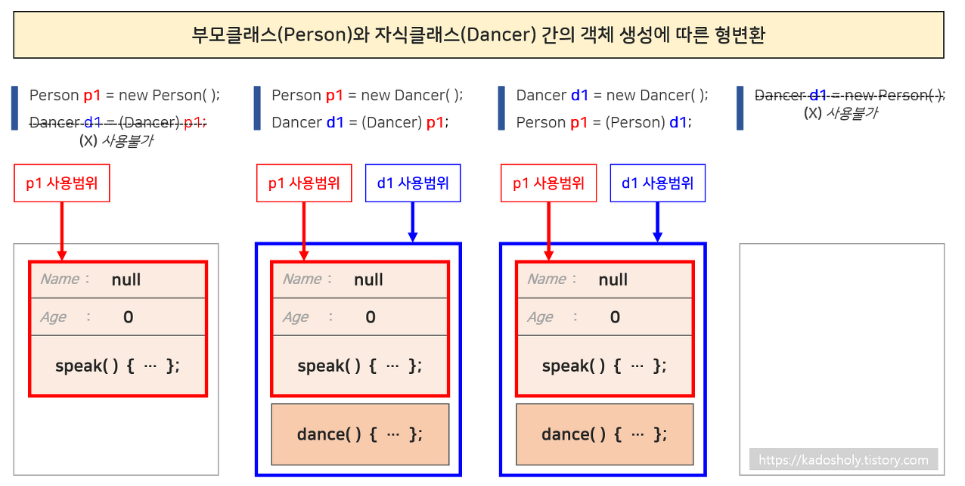 - 업캐스팅(Upcasting): 자식 클래스의 인스턴스를 부모 클래스의 참조 변수로 참조하는 것을 말합니다. 부모 클래스의 참조 변수를 통해 자식 클래스의 객체에 접근할 수 있습니다. 업캐스팅을 통해 여러 개의 자식 클래스를 하나의 부모 클래스 타입으로 관리할 수 있습니다.
