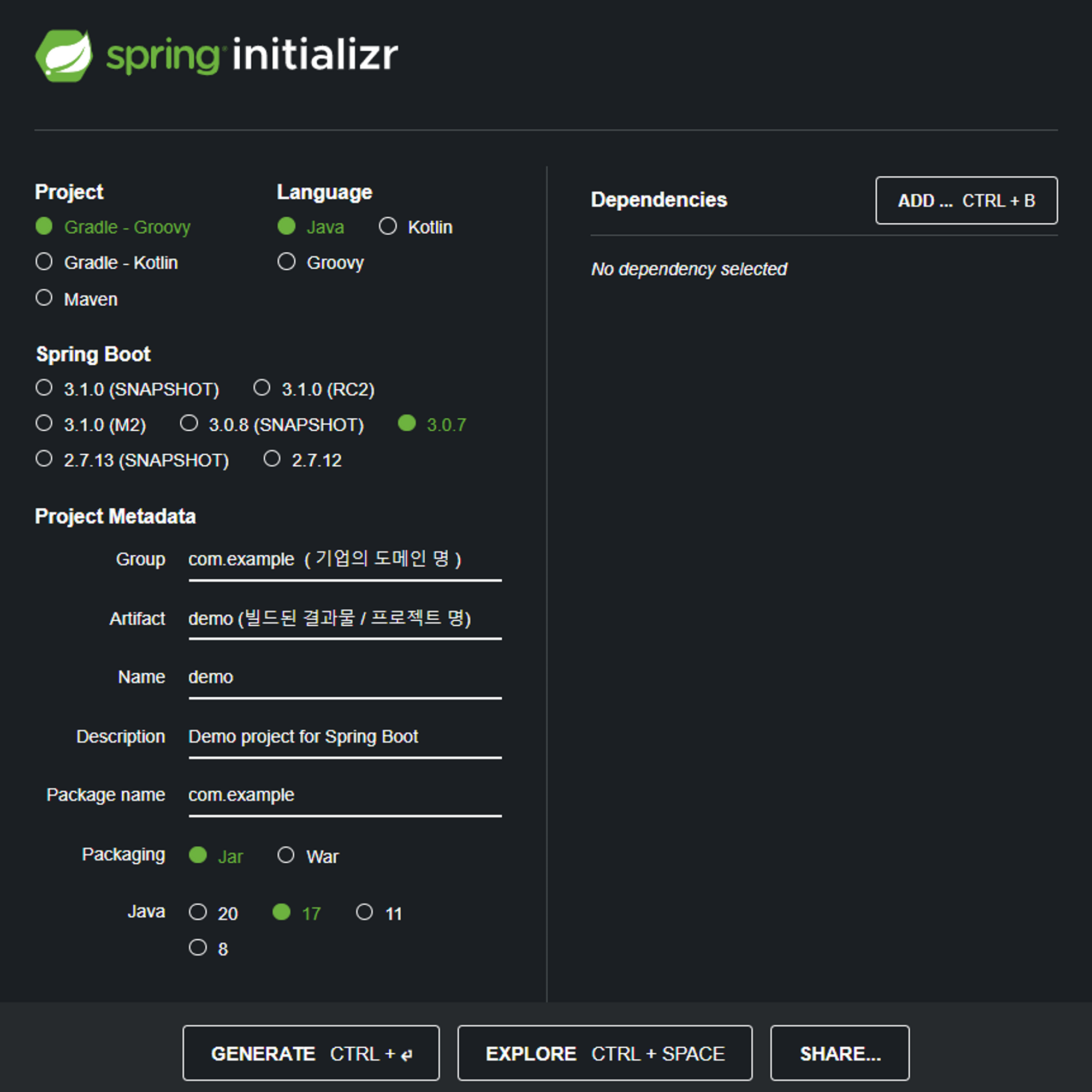 Dependencies - 프로젝트 시작 시 어떤 라이브러리를 불러와서 사용할 것인가를 고르는 것입니다.