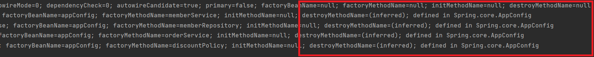 해당 TEST 코드를 실행하면 AppConfig.class에 등록 되어 있는 bean들의 메타 정보를 확인할 수 있습니다.