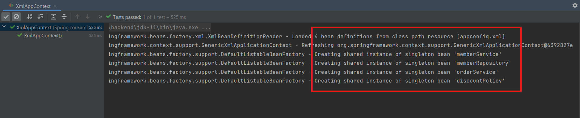 테스트코드가 실행이 완료되며, xml로 입력된 bean이 생성됨을 확인할 수 있습니다. 스프링의 싱글톤 빈으로 생성이 완료되었습니다