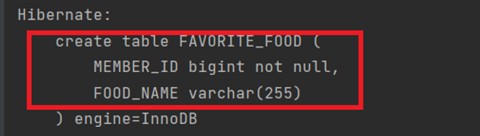 위의 코드에서 FavoriteFoods 필드와 Address는 @ElementCollection 어노테이션을 사용하여 사용자가 좋아하는 음식을 저장하는데, 이 필드의 값들은 FAVORITE_FOOD라는 테이블에 저장됩니다.