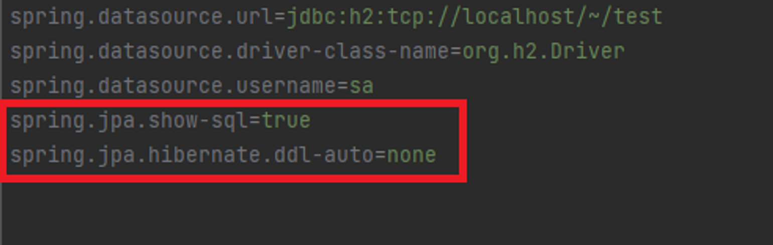 spring.jpa.show-sql=true 로 작성하면 jpa가 전달해주는 sql 데이터를 볼 수 있습니다. spring.jpa.hibernate.ddl-auto=none 를 작성하면 객체를 이용하여 테이블도 자동으로 생성해주는데, 자동으로 생성하는 기능은 끄고 작성할 예정입니다. 만약 none을 create로 작성 후 저장한다면 자동으로 테이블 생성도 가능합니다.