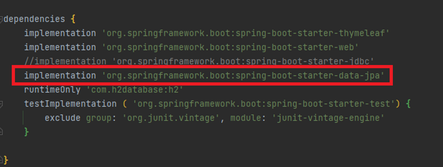먼저 JPA를 사용하기 위해서는 라이브러리를 다운받거나 설정해주어야 하는 것들이 있습니다. 먼저 build.gradle 에서 dependency에서 data-jpa 라이브러리를 입력하여 다운받아야합니다. 작성하게 되면 오른쪽 상단에 그래들을 새로고침해주는 코끼리모양의 버튼이 생기는데 해당 버튼을 클릭하여 dependency 업데이트를 진행합니다.