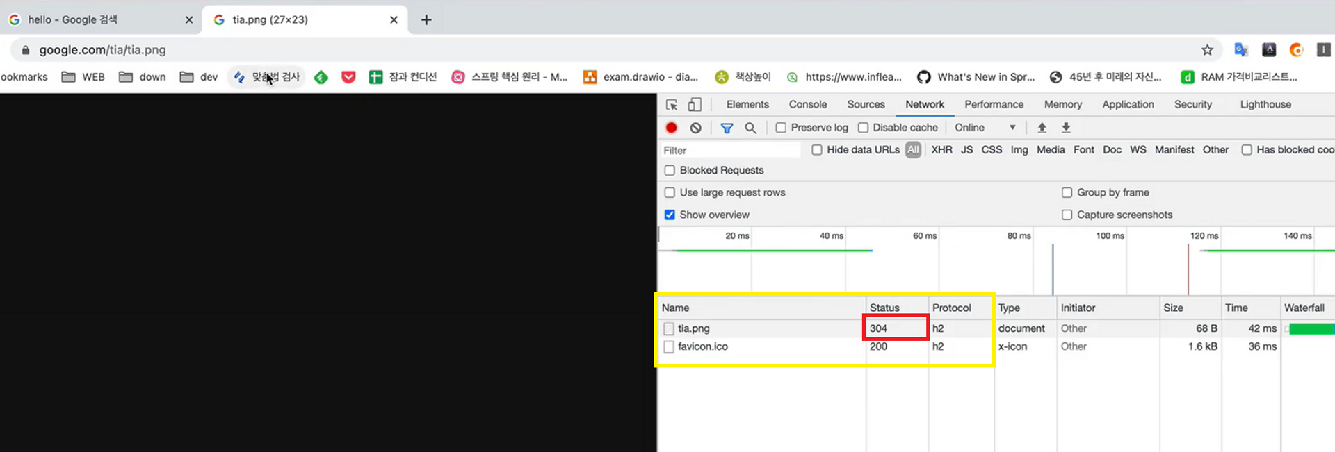 304로 응답이 왔다는 것은 요청 메세지 Request 시 if-modified-since 을 작성해서 보낸 것을 의미합니다. 해당 시간이 적힌 이후로의 데이터변경이 없음을 의미하므로 요청한 데이터와 동일한 데이터가 쿠키에 있기 때문에 새로이 응답 메세지를 보낸 것이 아니라 캐시에 보관되어 있던 응답 메세지를 보낸 것입니다.
